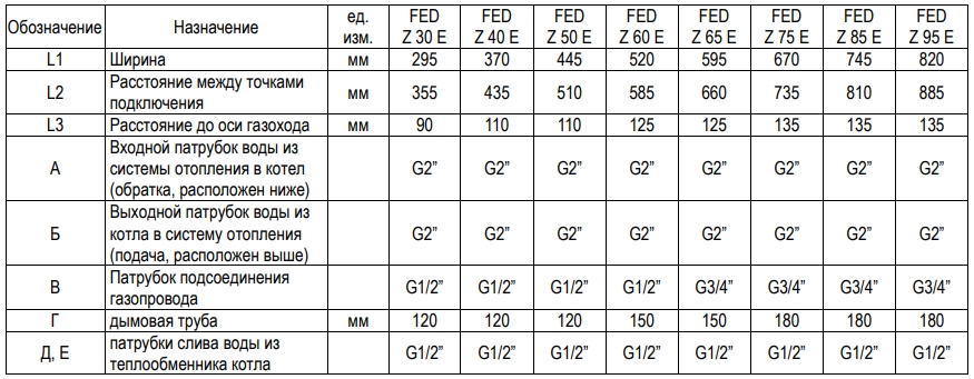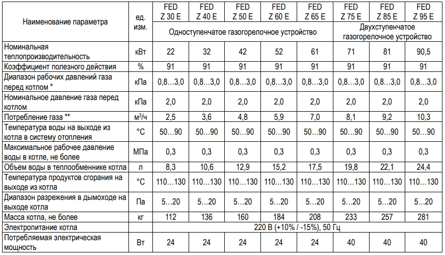 FED Z - газовый котел, имеющий открытую камеру сгорания. Высокий коэффициент полезного действия (91,5%). Наличие расширительного бака. Рабочее давление воды не более 0,3 МПа. Автоматическая блокировка подачи газа к горелке в случае: погасания пламени пилотной горелки; превышения температуры воды на выходе из котла; нарушения тяги в дымоходе котла; кратковременного прекращение подачи газа. Легкость в эксплуатации. Экологичность, т.е. имеет низкие показатели вредных выбросов. Долгосрочность оборудования.